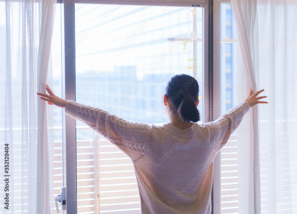 朝 採光 換気 カーテン 開ける 女性 若い 子供 日本人 人物 さわやか 朝日 窓 春