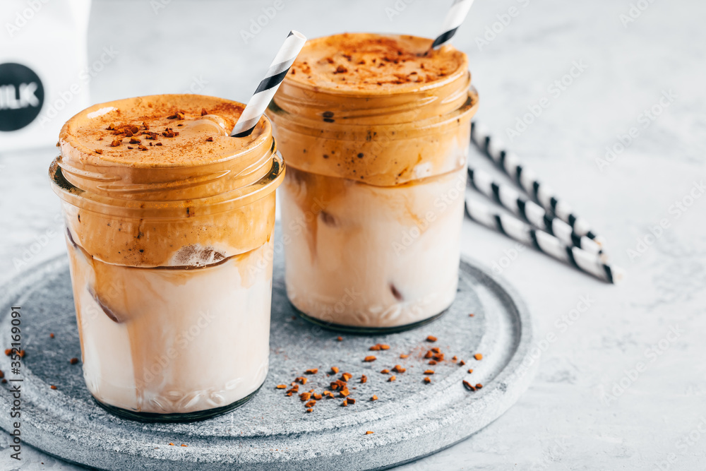 Dalgona coffee. Iced coffee with creamy whipped foam and almond milk.