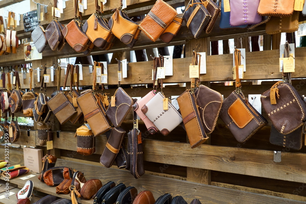 Bokeh image of leather material shelf in craft shop