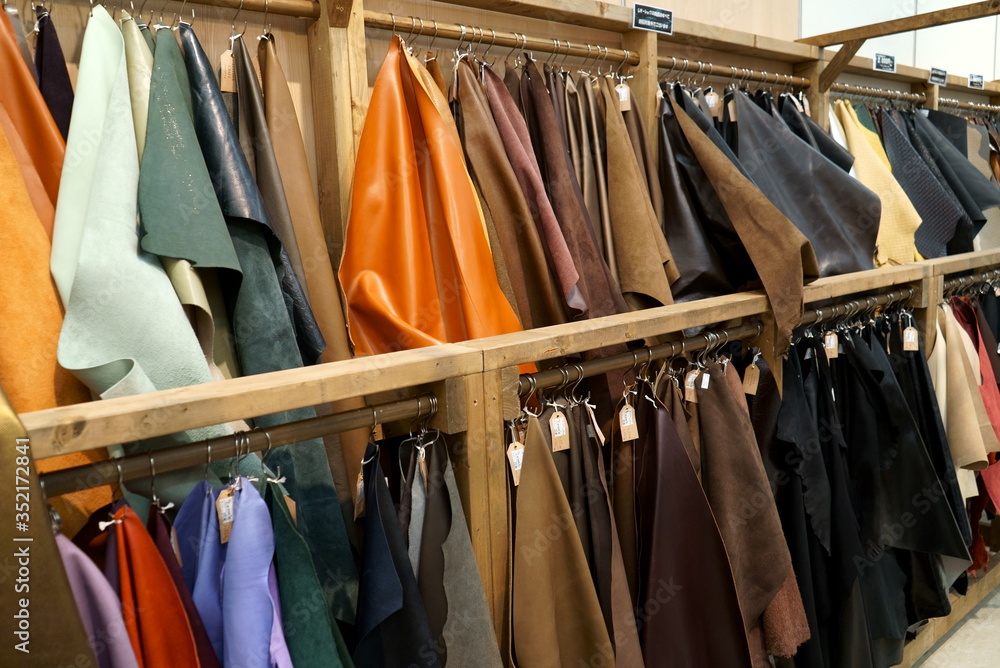 Bokeh image of leather material shelf in craft shop