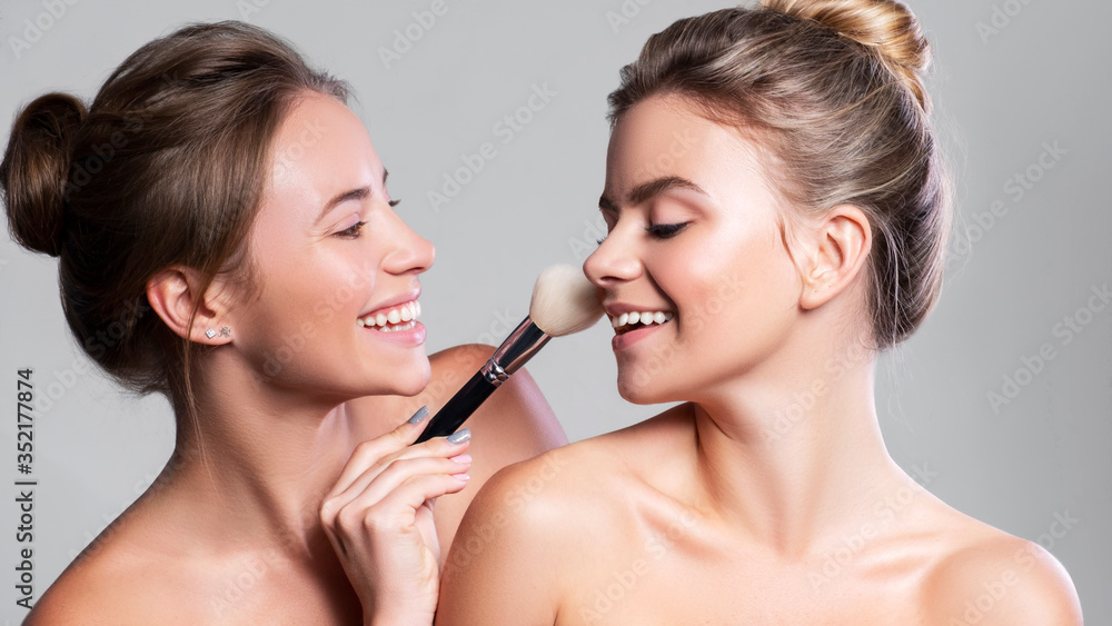 Close up of a brunette cute women faces with fresh clean flawless skin. One of them apply mascara on others face with a brush. Studio beauty portrait on grey background