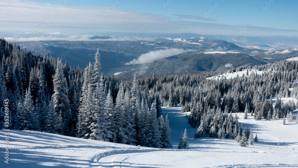Scenic view of snow covered mountainside at ski resort, Sun Peaks Resort, Sun Peaks, British Columbia, Canada