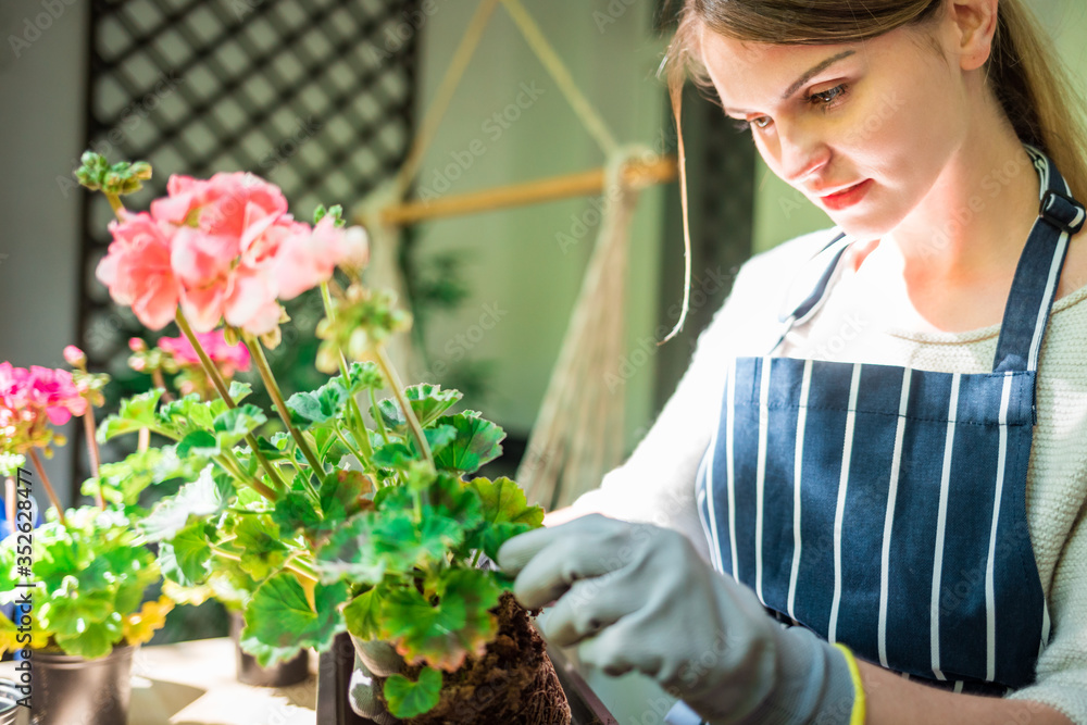 Woman planting flower on balcony at sunny spring day, home gardening