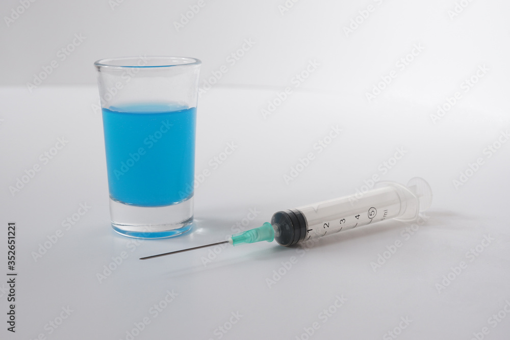 Laboratory tests. Syringe with blue toxin. New antiviral drug.