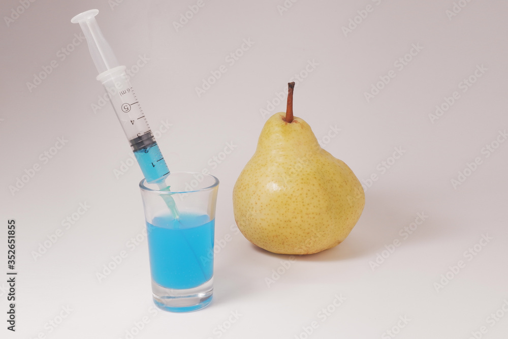 Syringe for injection close-up. Genetically modified pear. Injecting liquid from a syringe into a pear. Pesticides used in our food and fruit. Injecting blue liquid into an pear fruit.