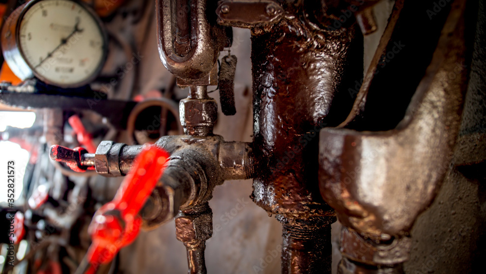 Closeup photo of pipes, tubes, vavlves and gauges on steam power engine at old locomotive