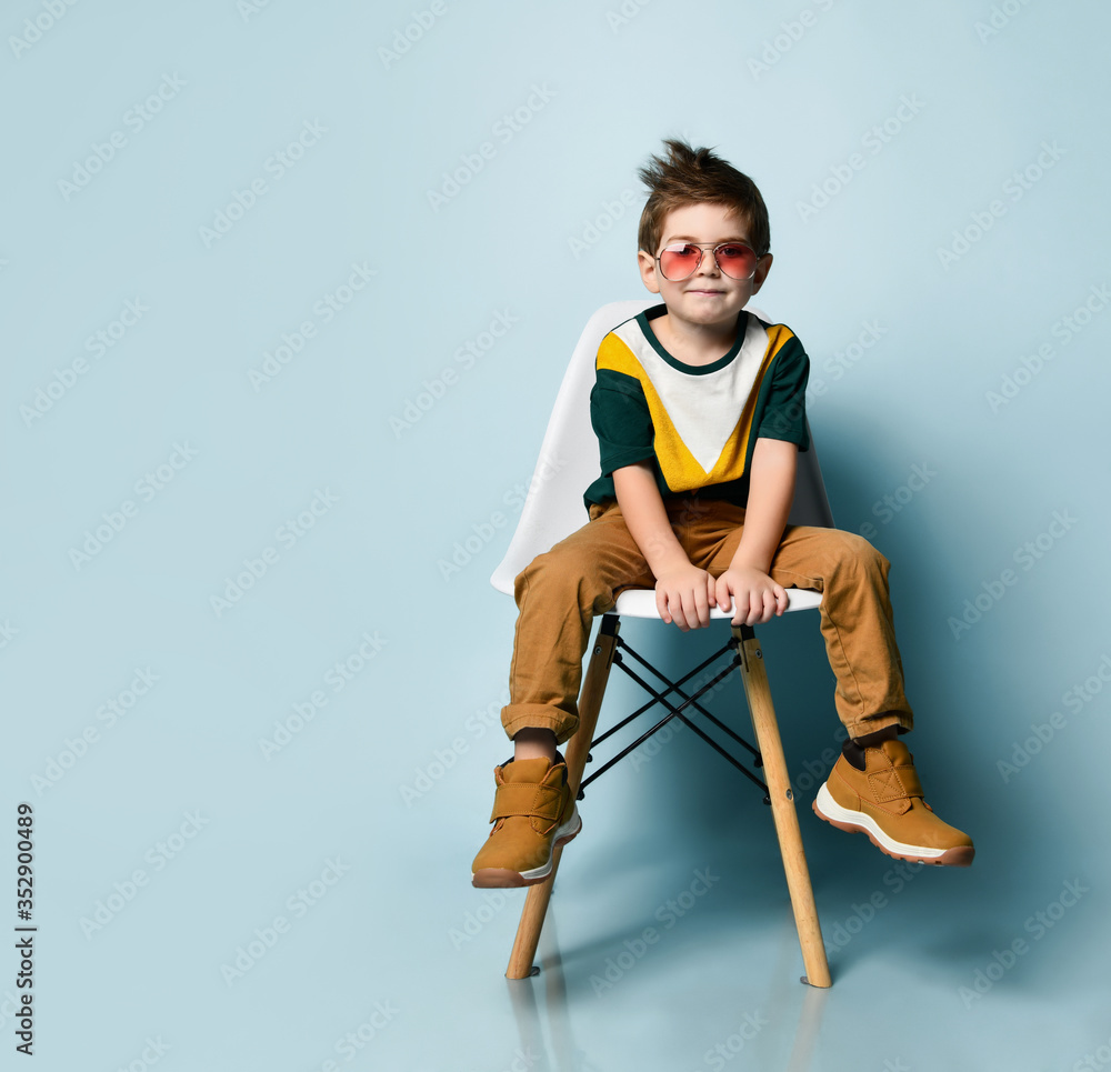 Brunet model in sunglasses, colorful t-shirt, brown pants and sneakers. Smiling while sitting on white chair. Blue background