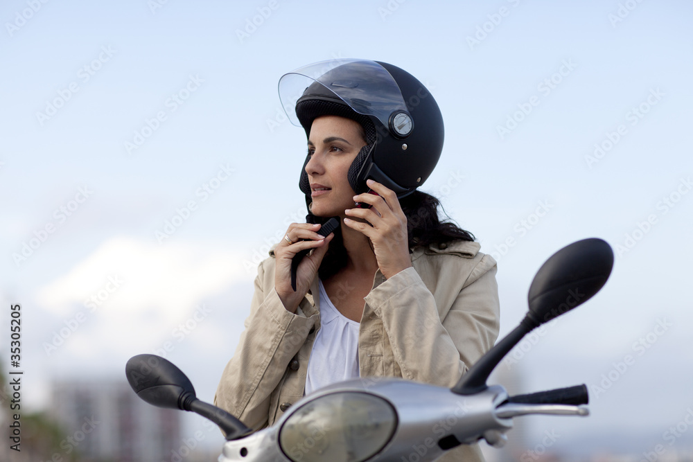 Attraktive Frau auf Roller zieht ihren Helm aus