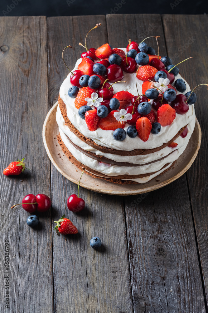 Delicious chocolate biscuit cake with cream cheese and berries: strawberries, blueberries, cherries on wooden table, black background, copy space.