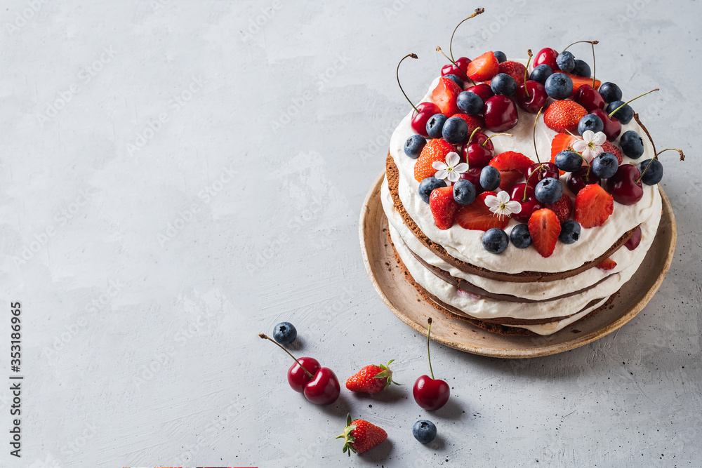 Delicious chocolate biscuit cake with cream cheese and berries: strawberries, blueberries, cherries on grey background, copy space.