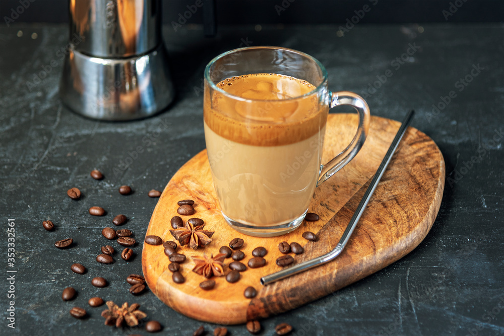 Dalgona coffee with foam in glass cup on cutting board, coffee beans and metal straw, black background, close up
