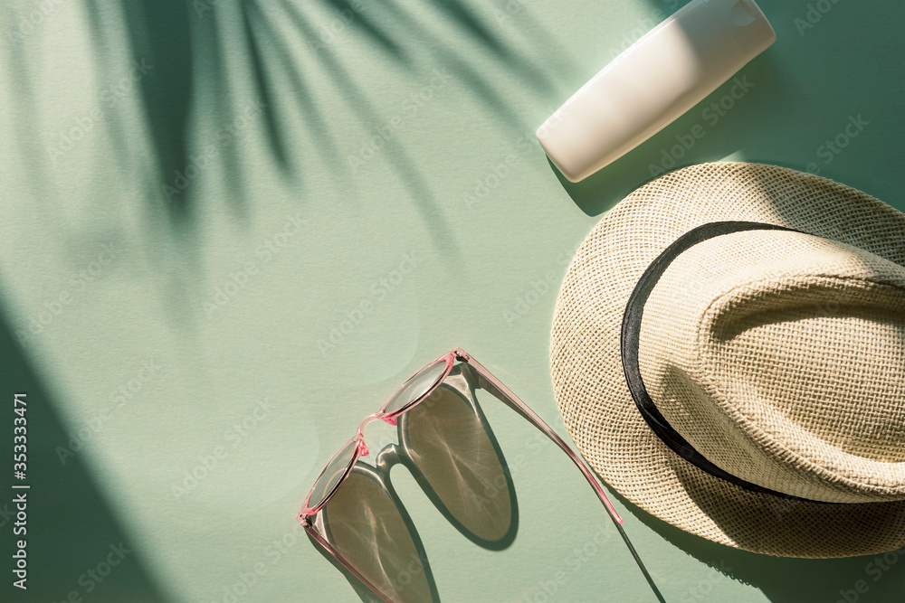 Sun hat, glasses and spf cream or lotion unbranded package on light blue background with palm tree leaf shadow, top view, flat lay. Summer vacation concept