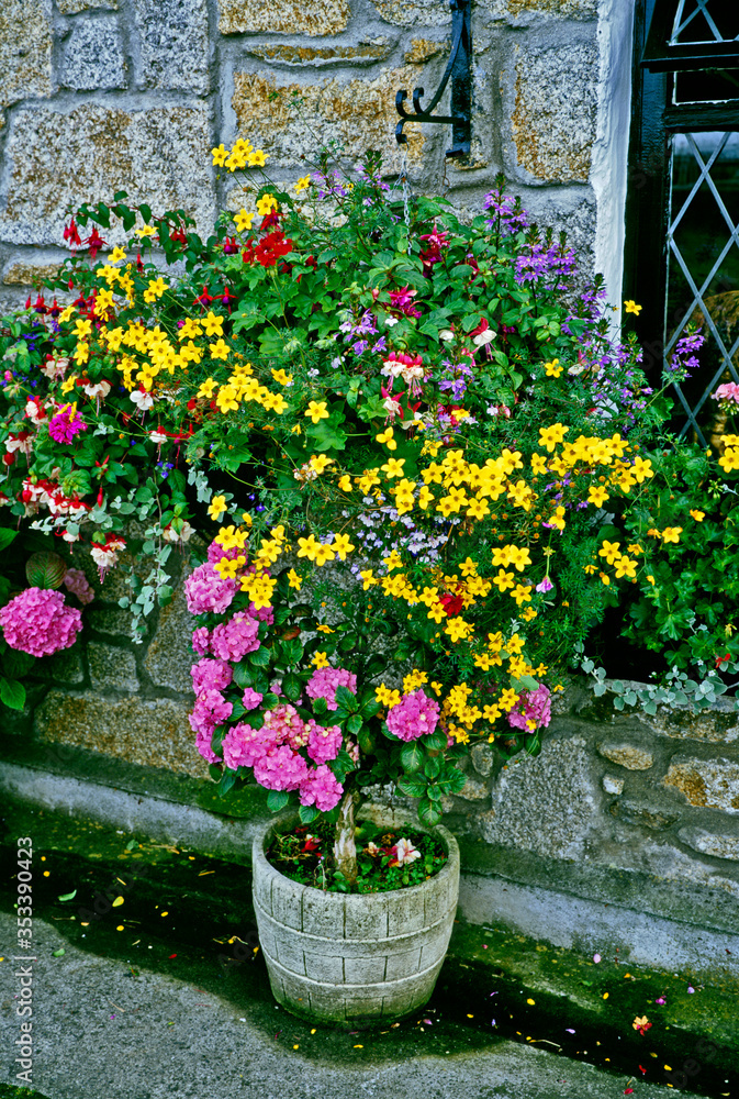 Colourful display of flowering Containers and Wall Baskets in a cottage garden