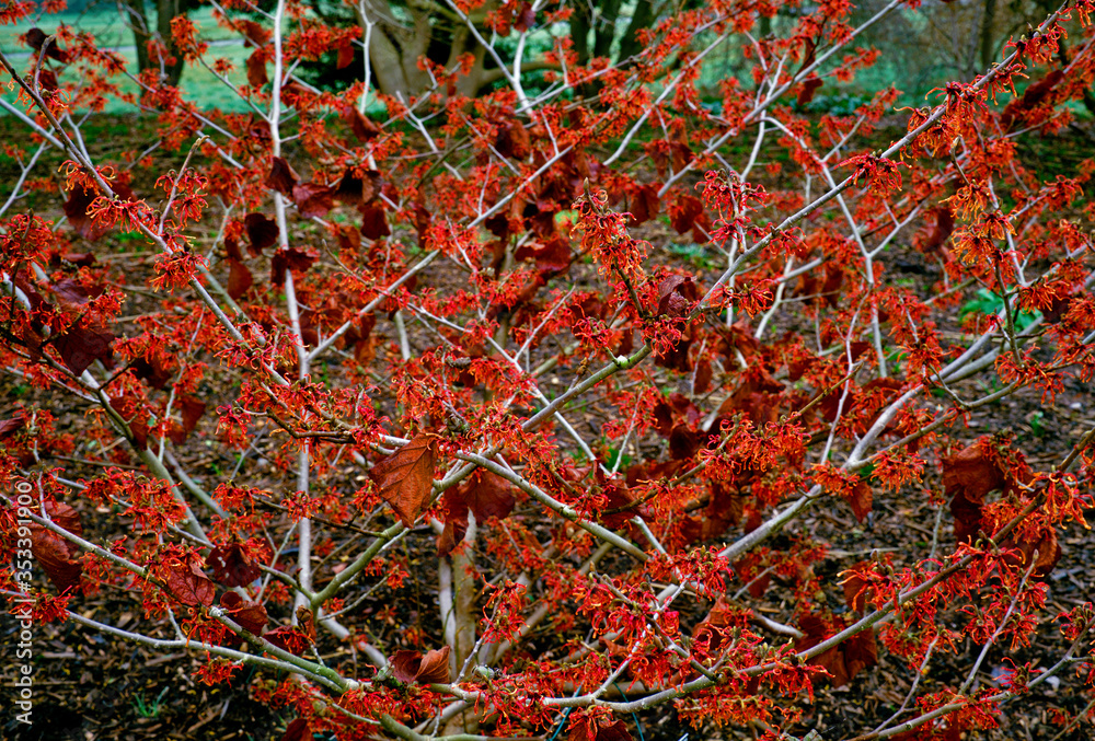 Witch Hazel Hamamelis x intermedia ‘Carmine Red’ in a woodland garden