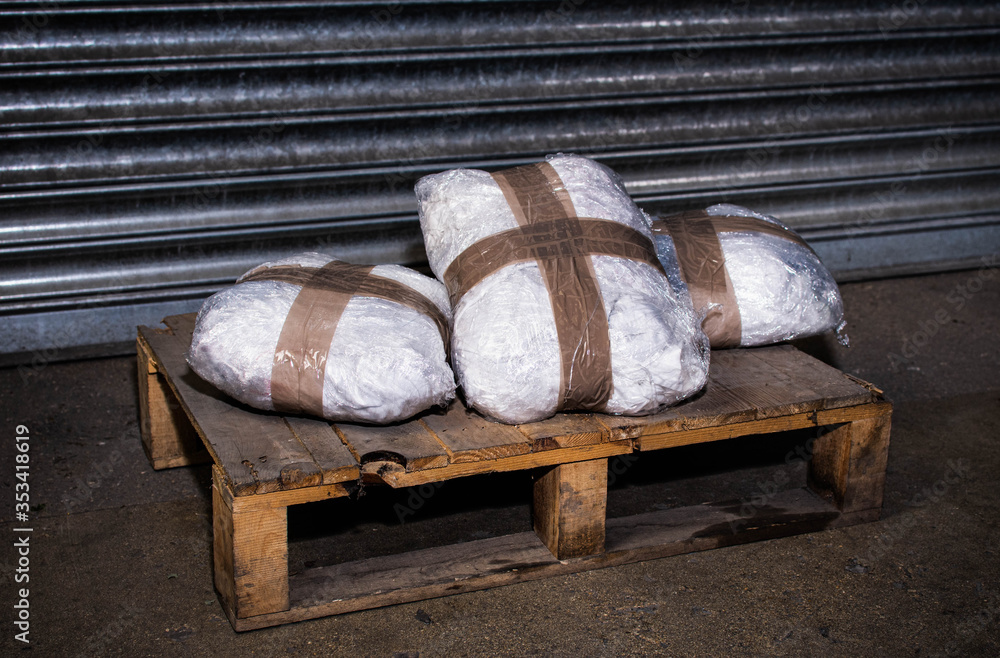 Cocaine or other illegal drug packages sitting on a pallet ready for delivery to drug dealers, rustic industrial background