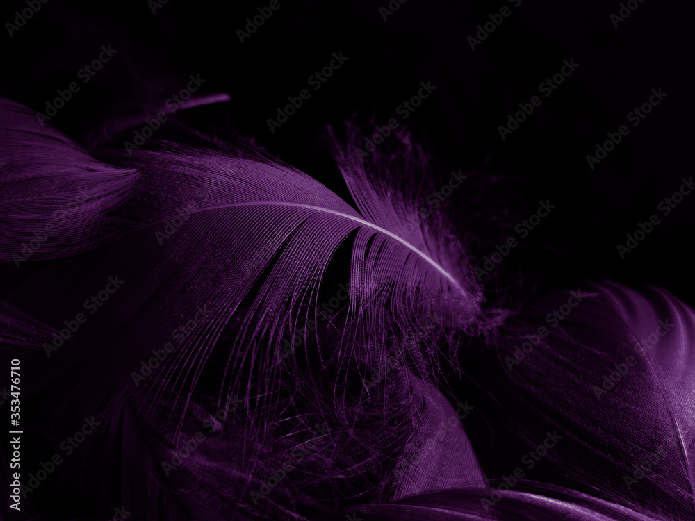Beautiful abstract white and purple feathers on black background and soft white feather texture on white pattern and purple background, feather pink background, purple banners
