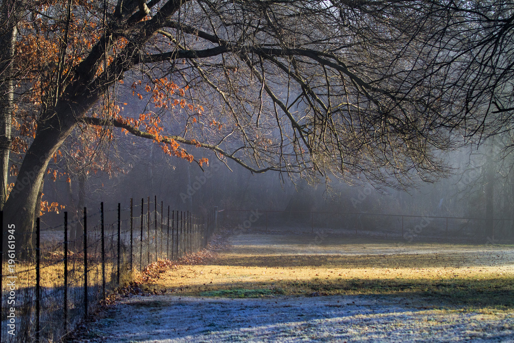 Empty streets with tram rails and overhead lines in Lisbon, Portugal.