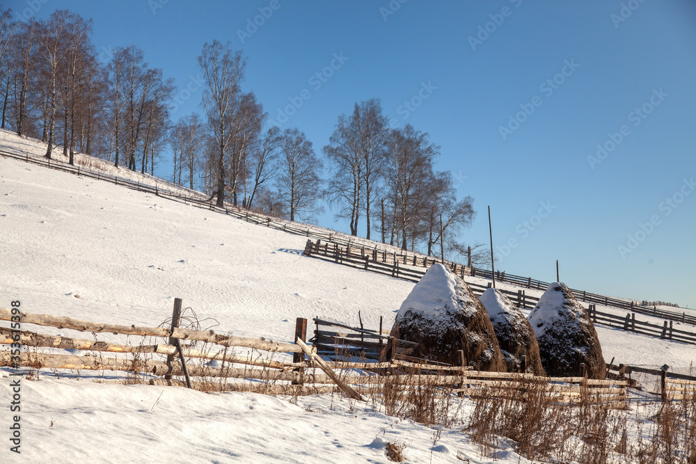 Winter landscape with haystacks on the hillside, fences and rare trees.
