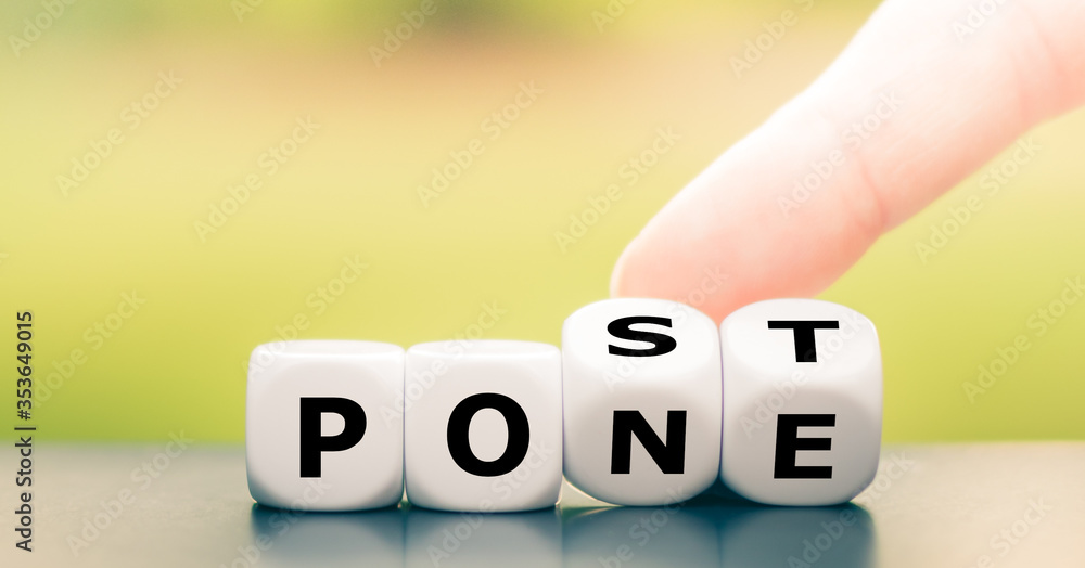 Postponed events regarding covid-19. Dice form the word "postpone".