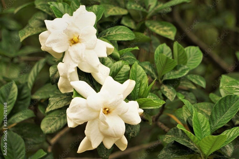 A pair of pretty gardenia flower (Gardenia jasminoides) blooming in the green leaf background , Spring in Georgia USA.