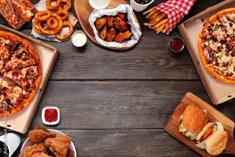 Variety of take out and fast foods. Pizza, hamburgers, fried chicken and sides. Frame. Top view on a dark wood background with copy space.