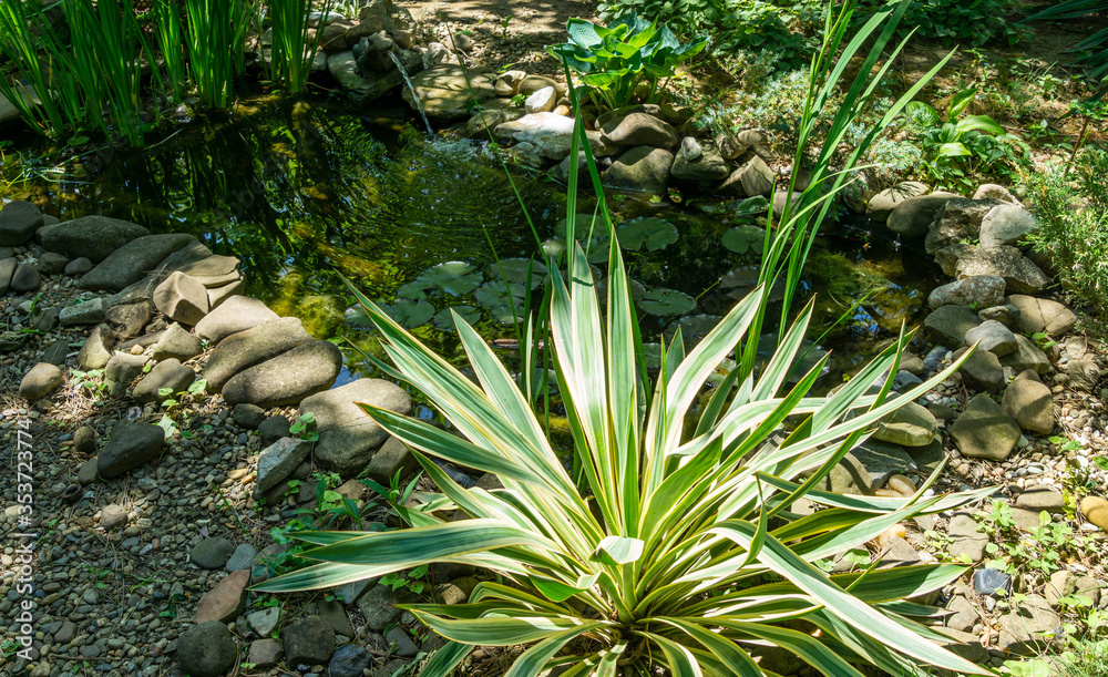 Beautiful striped leaves of Yucca gloriosa Variegata on shore of garden pond. Yucca growing in stones on shore of garden pond. Juniper Juniperus squamata Вlue star grow after pond. Sunny spring day.