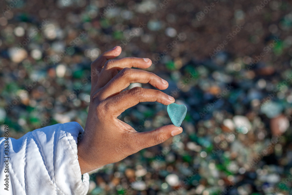 A brown indian hand holding a light glass piece shaped as heart by sea