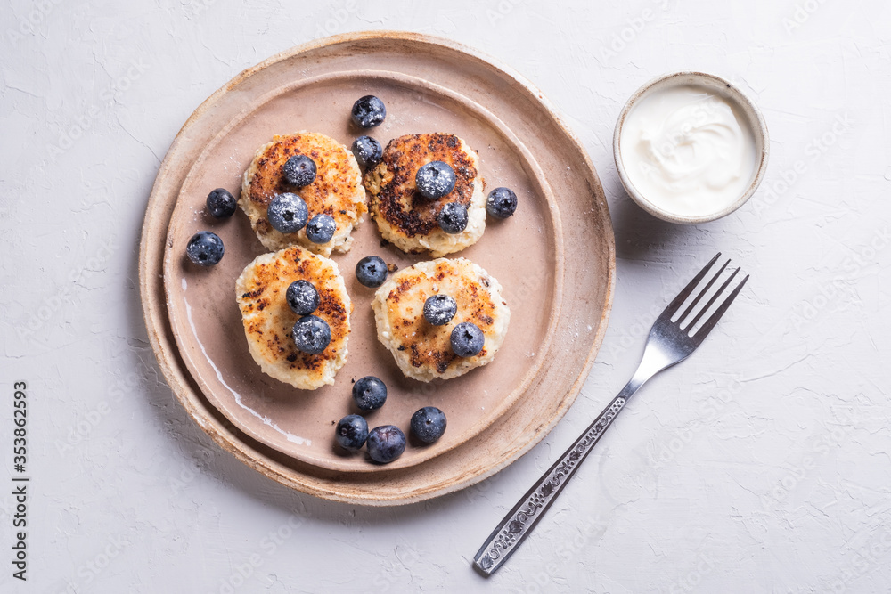 Healthy breakfast of cottage cheese pancakes, syrniki with blueberries and sour cream close-up in a plate on the table. light background