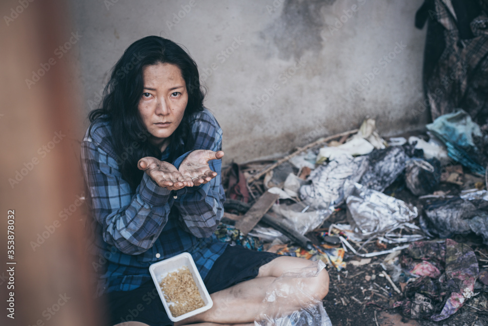 poor people,homeless or beggar begging for help sitting at dirty slum.concept for poverty hunger,human rights,donate and charity for underprivileged children in third world