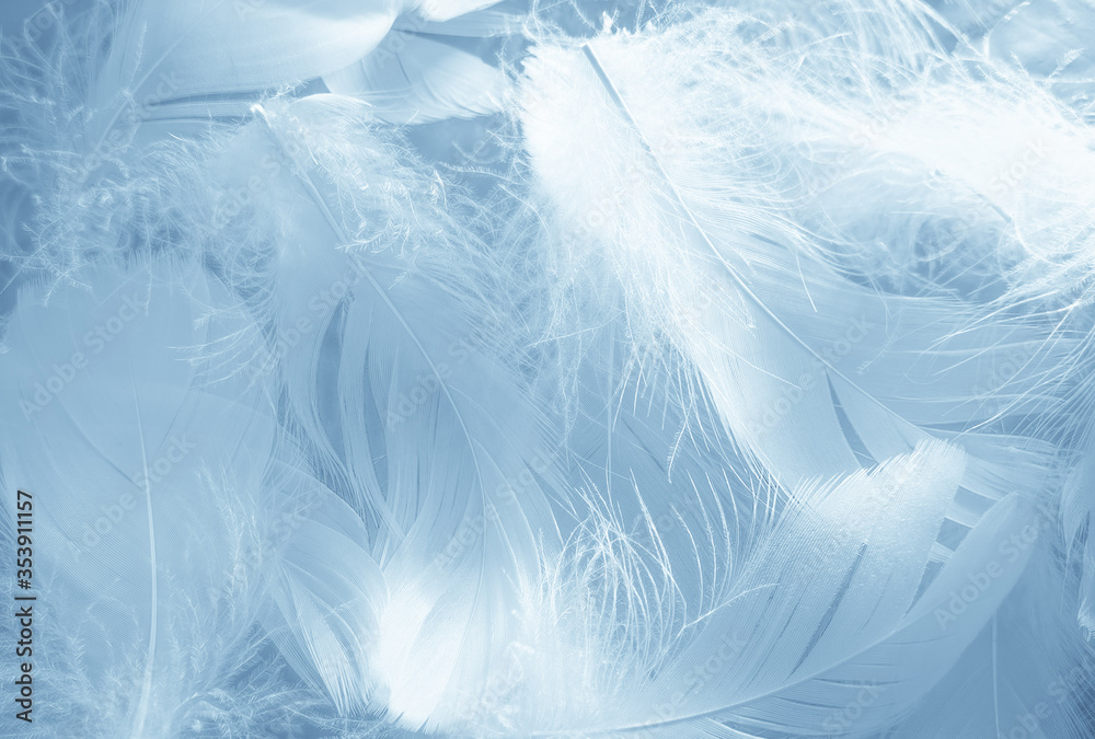 Beautiful abstract colorful white and blue feathers on white background and soft white feather texture on blue pattern and blue background, feather background, blue banners