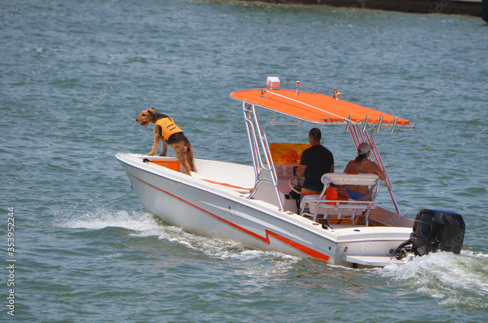 Young couple and their pet Airedale Terrior enjoying a Saturday afternoon cruise on Biscayne Bay in a small open fishing boat powered by a single outboard engine /