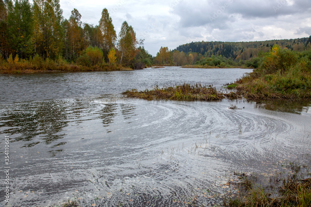 The colors of autumn. Golden autumn on a mountain river in Bashkortostan.