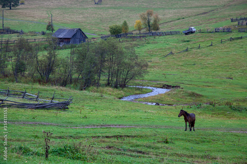 The colors of autumn. Golden autumn in the mountains of Bashkortostan. Mountain village.