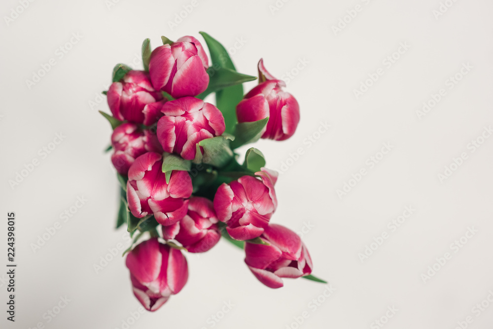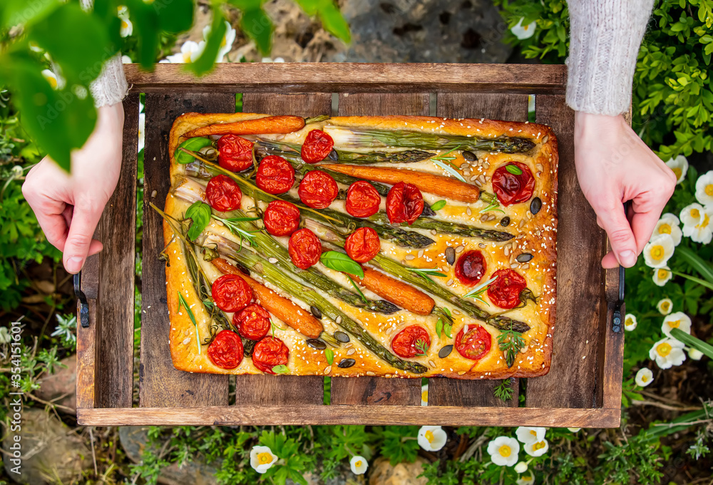 woman holds a tray of focaccia in the courtyard, with flowers on background