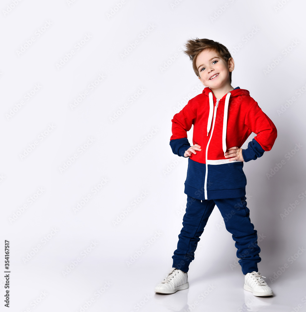 Little blond boy in blue and red tracksuit. He is smiling, put hands on hips, posing isolated on white studio background. Sport