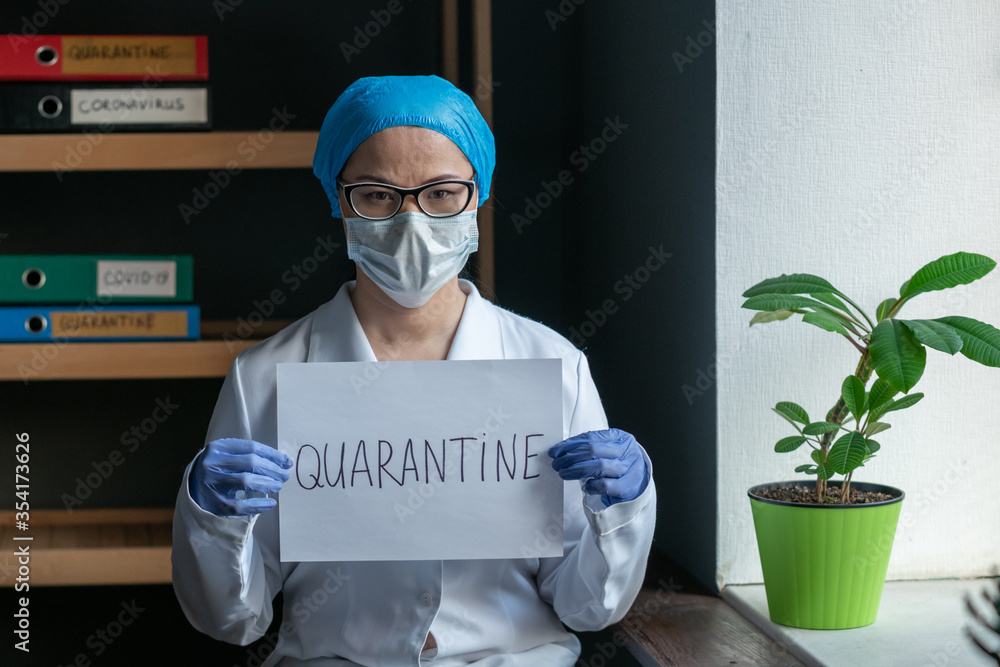 Doctor with Quarantine inscription on white blank. Female Medic in protective mask and uniform looks at camera standing not far from window with green plant on it. Pandemic concept.