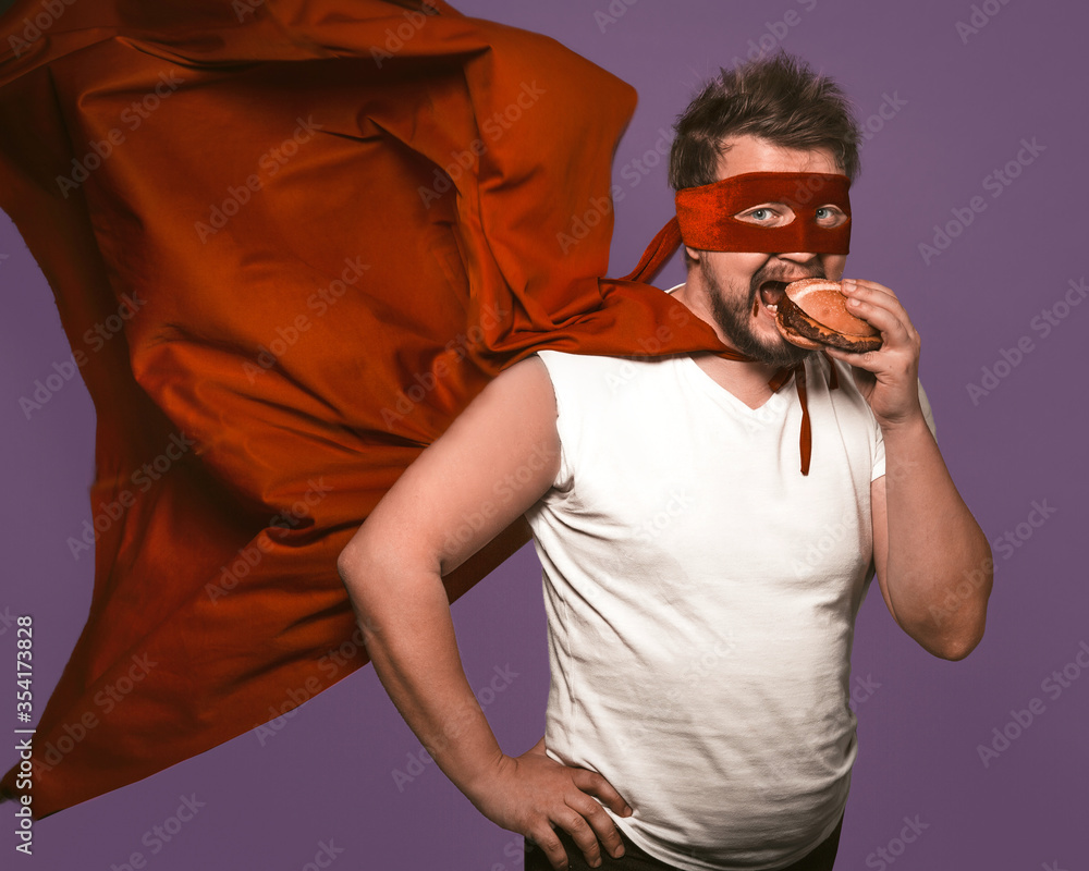 Hungry superhero man eats big hamburger with meat. Man in red flying cloak eats looking at camera on grape purple background. Fast food snack concept.