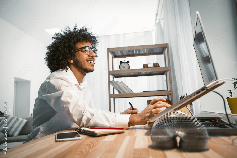 Inspired designer working on computer with new project. Young freelance man works on laptop sitting at home workplace. Side view. Toned image.