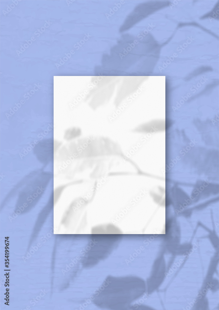 The vertical sheet of white textured A4 paper on the blue wall background. Mockup overlay with the plant shadows. Natural light casts shadows from an exotic plant