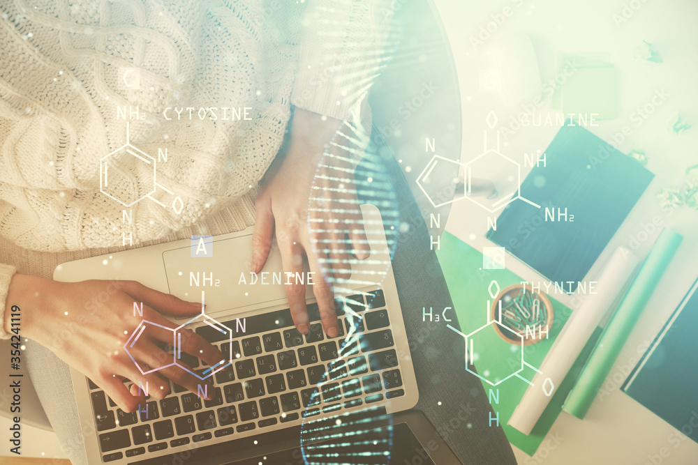 Double exposure of woman hands working on computer and DNA hologram drawing. Top View. Medical education concept.