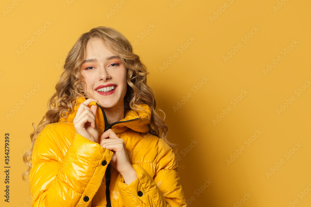 Young smiling woman in winter jacket on bright yellow background, close up portrait
