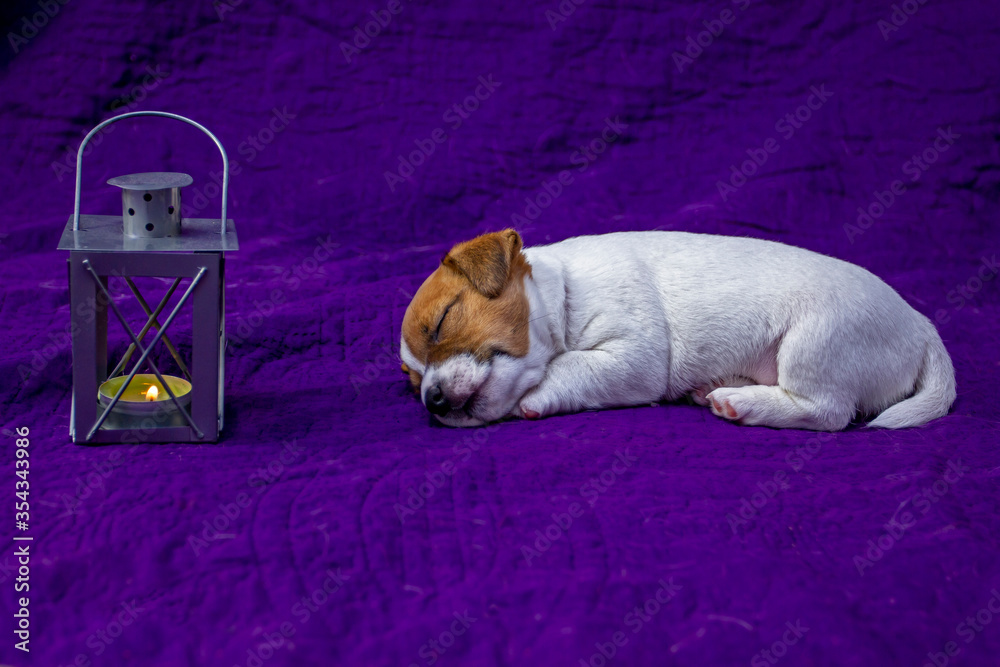 little puppy jack russell terrier sleeps near a nightlight, a gray lantern in which a candle is lit on a purple background.