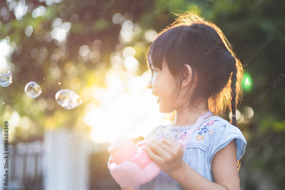 Beautiful 4 years old asian little girl is smiling with happy moment while she is playing bubbles outdoor.