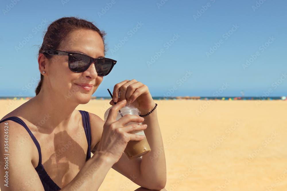 Portrait of a mature woman wearing sunglasses drinking freddo cappuccino - cold coffee over beach background.