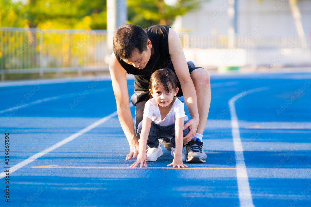 Asian father is teaching little daughter practice how to start at the line for run competition, concept of sport, outdoor activity for child.