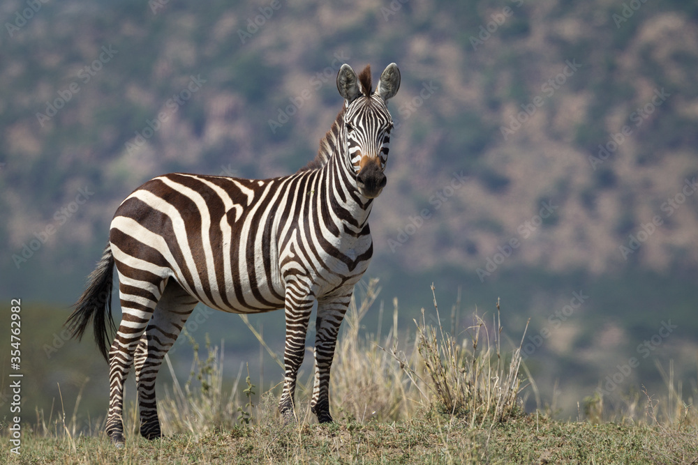 One alert adult Zebra standing alert in the Serengeti Tanzania