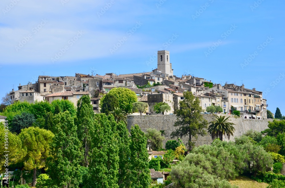 The medieval town of Saint-Paul-de-Vence in Provence-Alpes-Côte d’Azur in France, panoramic view, blue sky background, a sunny day