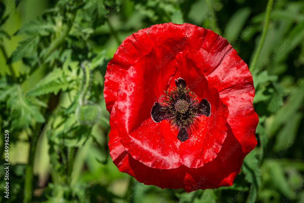 Scarlet Common Poppy (Papaver rhoeas) closeup on background of bright green foliage. Fresh wallpaper nature concept for design. There is a place for your text.
