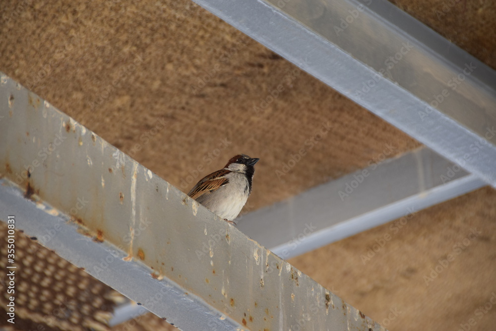 Sparrow sitting on a metal pole with bird shit under a roof next to the church in memory of Moses, Mount Nebo, Jordan