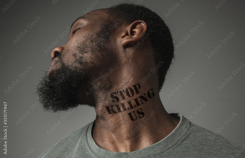 Close up black man tired of racial discrimination has tattooed slogan stop killing us on his neck. Concept of human rights, equality, justice, problem of violence and racism, discrimination.